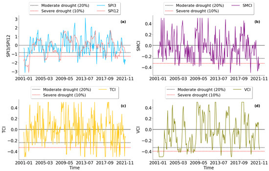The VCI based on the NDVI, reflects the condition of vegetation during a drought event. It has been used and evaluated in several regions of the world [46,47,48,49]. The VCI is a simple normalization of the NDVI that is intended to present anomalies over a period. The subtraction of 0.5 from the VCI, TCI, and SMCI values was intended to capture negative anomalies in the index time series. In addition, the transformation into a range between −0.5 and 0.5 facilitates the interpretation of anomalies.