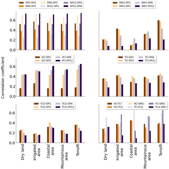 Comparative Pearson correlation at a monthly scale between the SPI, VCI, TCI, TCI2, and SMCI for the whole basin and for different sites.