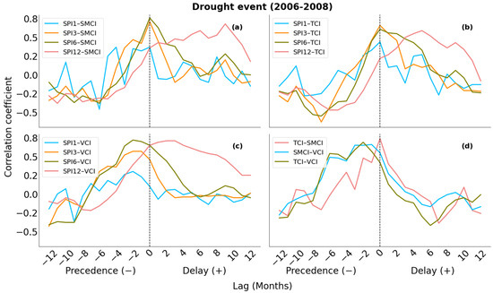 Cross-correlation between the (a) SPI–SMCI, (b) SPI–TCI, (c) SPI–VCI, and (d) TCI–SMCI, SMCI–VCI, and TCI–VCI for the drought event (2006–2008).
