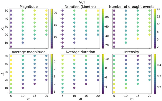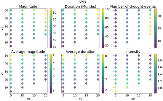 Figure 9 and Figure 10 show the results of the drought characteristics extracted for each pair of (x0, x1) to highlight the importance of the choice of these parameters, which directly affect the number of droughts per period and their intensity. The identification of drought events follows a structured process. The initial criterion involves the index falling below the x0 threshold, marking the declaration of a drought. We then go back in time to identify the onset of drought, starting with x1, which serves as the threshold for normal conditions. The drought is terminated when the index rises once again above the x1 threshold. The 25–30% level is generally considered a threshold between dry and drought [26], while the 50% level (which for the SPI means 0) was considered by [7] as the level for normality.