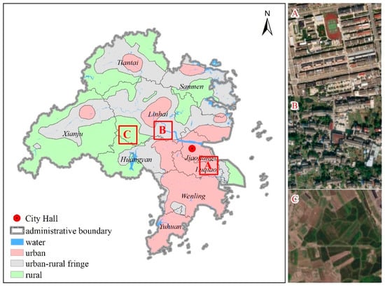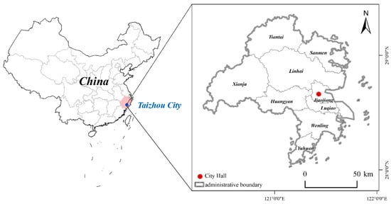 Taizhou is situated within the Yangtze River Delta region, characterized by a topography that slopes from high in the west to low in the east. It spans a length of 145.6 km from east to west and 147.8 km from north to south (Figure 1). Taizhou stands as a prominent industrial hub within Zhejiang Province, boasting a comprehensive industrial infrastructure and pivotal industries []. Furthermore, it serves as a significant center for parts and mold production in China, with 48 manufactured products holding the highest market share in the nation []. In 2022, the city’s population was 6.68 million, and its gross domestic product was CNY 604.07 billion. The administrative structure of Taizhou City encompasses three districts, Jiaojiang, Huangyan, and Luqiao; three county-level cities, Linhai, Wenling, and Yuhuan; along with three counties, Tiantai, Xianju, and Sanmen []. In the course of urban development, Taizhou’s urban fringe areas have emerged as the most dynamically evolving regions. These areas have been significantly influenced by a multifaceted interplay of urban and rural elements, serving as a frontier for promoting urban–rural integration. Consequently, this transformation has precipitated inherent contradictions within urban–rural fringe areas, spanning population, environmental, industrial, and other dimensions []. As such, these areas have become focal points of concern within the urban development planning process.