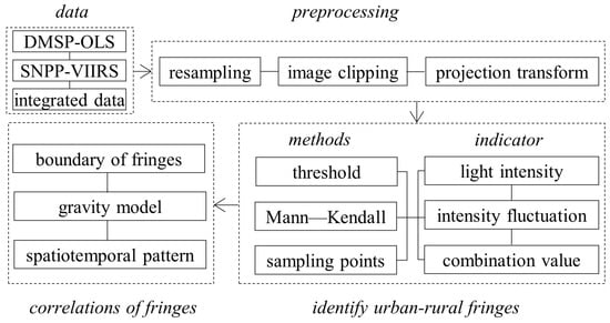 Taizhou City encompasses three distinct geographical categories: urban, urban–rural fringe, and rural areas. The urban–rural fringe region serves as a transitional zone bridging the gap between urban and rural environments. It differs from the other two categories in terms of population, economic activity, and other factors. This study employs nighttime light data to capture the distinctive activity patterns across these various zones. To ensure the validity of different nighttime lighting data, DSMP-OLS and SNPP-VIRSS and integrated data were used in this study. The characterization of different regions is achieved through key indicators such as nighttime light brightness, light fluctuation, and composite feature values. A dataset of 360 sampling lines and 9841 sampling points was established, allowing for the delineation of boundaries between urban and rural fringe areas using a combination of threshold methods and an enhanced Mann–Kendall detection algorithm [,,]. To comprehensively analyze the dynamics of these fringe areas, an attraction model is employed to assess the gravitational pull exerted by these zones in 2010, 2015, and 2020 []. This model facilitates the examination of spatial and temporal variations and interactions among the fringe areas (Figure 2).