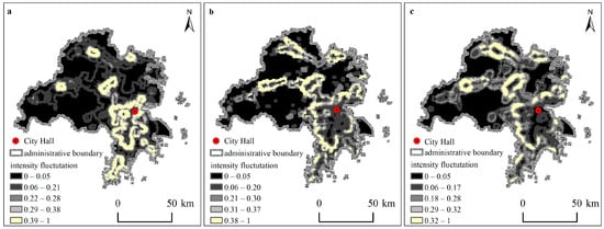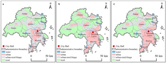 Schematic of spatial distribution in urban, urban–rural fringe, and rural areas for 2010 (a), 2015 (b), and 2020 (c).