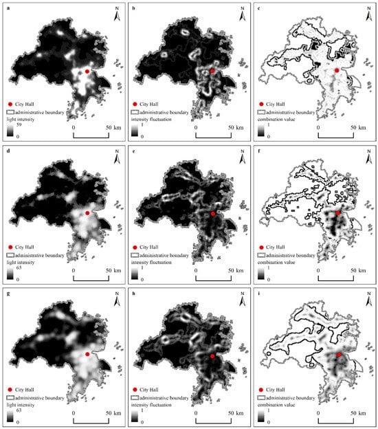 Light intensity (a), intensity fluctuation (b), and combination value (c) in 2010; light intensity (d), intensity fluctuation (e), and combination value (f) in 2015; light intensity (g), intensity fluctuation (h), and combination value (i) in 2020 (the brightness of the image represents the values).