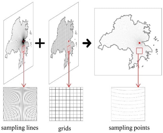 Building upon the feature combination values of nighttime light intensity, our aim is to enhance the precision in identifying the boundary transition points of the urban–rural fringe area. To achieve this, we seek to identify recurring patterns within the feature combination values and pinpoint the breakpoints by strategically placing sampling points. We adopt the city hall as the central reference point, establishing the east direction as 0°. Subsequently, we position sampling lines at 1° intervals, resulting in a total of 360 profile lines spanning Taizhou. Resampling at 1° intervals can be carried out in a way that ensures a uniform distribution of sampling points without affecting the computational efficiency. The implementation of this process is carried out in Python, running the script in the Arcpy module of ArcGIS. Concurrently, a spatial grid with a scale of 1 km is meticulously created within the study area, aligning with the spatial resolution of the nighttime lighting data. The profile line layer is then superimposed onto the grid, allowing us to identify the sampling points at the intersections of the profile lines and the grid. This meticulous approach yielded a total of 9841 sampling points (Figure 5).