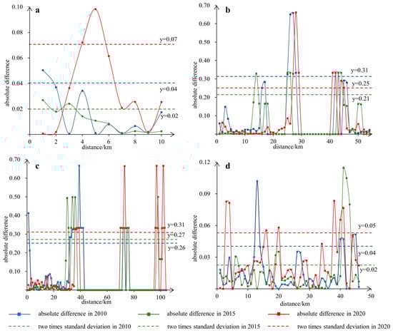 where Dij is the absolute difference of the combined value of the feature group of the jth point on the ith sampling line, and Cij, Cij−1, and Cij+1 are the combined values of the features of the jth, j−1, and j+1 sampling points on the ith sampling line. And Si is the critical threshold value of the breakpoint on the ith sampling line. When Dij is larger than Si, then Dij is labeled as the breakpoint of this sampling line. The absolute difference change curves for the years 2010 and 2020 were produced using the four sampling lines of 0°, 90°, 180°, and 270° as representatives (Figure 6). The dashed line represents the critical threshold of the mutation point for that year, and the points above the dashed line represent the breakpoints on this sampling line. In order to exclude the influence of anomalies on boundary confirmation, sampling points located at the tail end of the sampling line at the administrative boundary and some dispersed anomalies were excluded. The removal of breakpoints was primarily considered from the following perspectives. Firstly, some isolated points were scattered in small areas, failing to form closed regions with neighboring points. Secondly, certain abrupt points were distributed along the boundaries of the study area, which did not align with the understanding of peri-urban areas. Lastly, there were some clustered points, and the removal aimed to eliminate nearby interfering points to clarify connections with adjacent points. Based on these considerations, the removal of certain abrupt points was implemented. Breakpoints were ultimately achieved at the outer fringe boundary for both years (Figure 7). The map of the urban–rural fringe area of Taizhou was obtained by connecting the breakpoints in a smooth order and making some corrections.