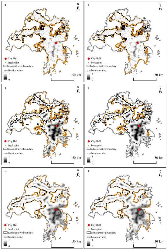 The breakpoints at the boundary between urban–rural fringes and rural areas (a) with removed outliers (b) in 2010; the breakpoints at the boundary between urban–rural fringes and rural areas (c) with removed outliers (d) in 2015; the breakpoints at the boundary between urban–rural fringes and rural areas (e) with removed outliers (f) in 2020.