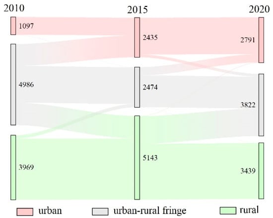 Following the delineation thresholds for nighttime light intensity, fluctuations, and combination values, Taizhou City is classified into urban, urban–rural fringe, and rural regions. Urban areas covered 10.91%, 24.22%, and 39.42% of the total area in 2010, 2015, and 2020, respectively, showing a notable growth trend. Specifically, from 2010 to 2015, 1382 km2 of fringe areas transitioned to urban, while 131 km2 of rural areas became fringe areas. Between 2015 and 2020, 508 km2 of fringe areas transformed into urban areas, and 1691 km2 of rural areas shifted to fringe areas. In a comprehensive analysis, it becomes evident that urban areas are characterized by a discernible trend of expansion, whereas fringe areas display dynamic fluctuations. The delineation between fringe and rural areas introduces a nuanced layer of ambiguity and uncertainty within the classification framework (Figure 8).