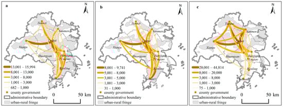 Spatial correlation strength schematic among urban–rural fringe areas in different counties for 2010 (a), 2015 (b), and 2020 (c). (Numerical values indicate spatial attractiveness between different regions, where thicker lines and darker colors signify stronger gravitational forces).