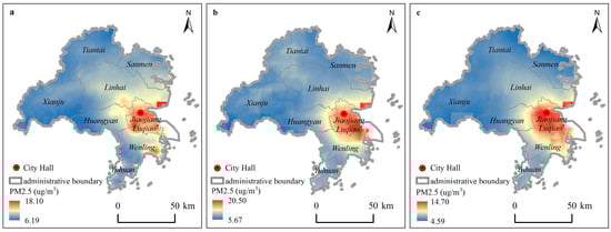 Spatial distribution of average PM2.5 concentrations in 2010 (a), 2015 (b), and 2020 (c).