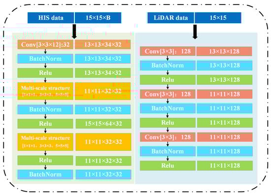 Given a LiDAR data , similarly, we crop into image block and transfer it to the LiDAR feature extraction module. In the LiDAR feature extraction module, three 2D-CNNs with a kernel size of are employed for feature extraction. The extracted LiDAR features are then concatenated with an HSI feature extraction branch for the feature fusion module. The overall parameter configurations of the feature extraction modules of HSI and LiDAR data are shown in Figure 3.