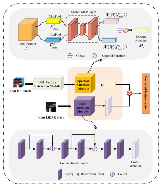 In previous multimodal data fusion classification networks, feature extraction was performed independently on each data branch. These networks did not facilitate the interactions to share high-level features between different modalities, leading to a low quality of feature fusion and classification performance. Therefore, in this paper, we first introduce the spectral attention mechanism module to allocate weights of spectral channels in HSI. Then the cross attention mechanism is incorporated to enhance the correlation between HSI and LiDAR data, which extracts attention masks from LiDAR data and subsequently employs them to enhance the representation of HSI spatial features. The whole framework of the attention mechanism module is depicted in Figure 4.
