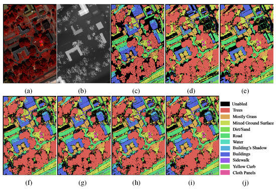 Dataset visualization and classification maps of the Houston dataset obtained with different models. From left to right: (a) HSI, (b) gray image for LiDAR, (c) label, (d) SVM (H), (e) SVM (H + L), (f) FusAtNet (H), (g) FusAtNet (H + L), (h) ours (H), (i) ours (H + L), (j) legend.
