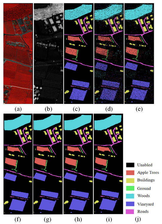 Dataset visualization and classification maps of the Trento dataset obtained with different models. From left to right: (a) HSI, (b) gray image for LiDAR, (c) label, (d) SVM (H), (e) SVM (H + L), (f) FusAtNet (H), (g) FusAtNet (H + L), (h) ours (H), (i) ours (H + L), (j) legend.