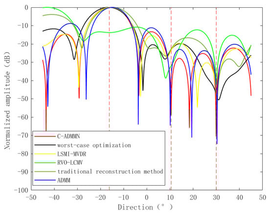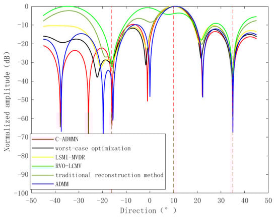 The simulation results indicate that all the algorithms successfully suppress interference; however, the strong RVO-LCMV algorithm exhibits a significant offset in the main lobe, and the traditional reconstruction method algorithm demonstrates notably high side lobes. The ADMM algorithm and the proposed C-ADMMN algorithm exhibit the ability to preserve favorable main and side lobe characteristics while effectively suppressing interference. In comparison, the C-ADMMN algorithm, being closer to the interference direction, demonstrates superior performance.