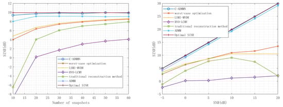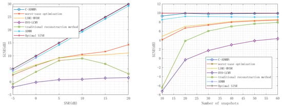 The performance of different algorithms is compared in this section. Considering that the input data are damaged by the target signal, the other parameter settings are the same as in scenario 1. Two hundred Monte Carlo experiments were used to calculate the average output SINR, where the optimal SINR is calculated on the premise that all information is fully known and the test data are not affected by the target. The performance of different algorithms versus SNR and snapshot is shown in Figure 11 and Figure 12. It can be noticed that the relative ADMM algorithm has a performance second only to the C-ADMMN algorithm, which is the basis of the advantages of the algorithm. The utilization of the trained C-ADMMN yields better beamforming performance and consistently has the best performance throughout the process of SNR and fast beat number changes. In addition, under different SINR and fast beat conditions in the experiment, the trained network in scene 1 was used. For different target and interference situations, the output SINR is the same as Figure 11 and is not drawn repeatedly here. This shows that the trained network has a good universality.