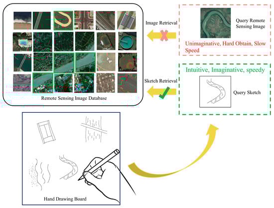 The proliferation of remote-sensing sensors deployed on various carrier platforms has led to a continuous and rapid increase in the volume of observation data pertaining to the Earth’s surface. The data generated by these sensors possess the characteristics commonly associated with big data: it is voluminous, exhibits a wide variety, is generated at high velocity, and requires rigorous verification. While this abundance of data offers users unprecedented opportunities to discover and quantify underlying phenomena, it also presents many challenges [,,]. The challenges in remote-sensing big data include data management, analysis, retrieval, and interpretation complexities. Among these challenges, data retrieval—accurately and efficiently finding the desired category images from a massive amount of remote-sensing images—is crucial for subsequent data mining processes []. Traditional query inputs typically involve image metadata values, such as bounding box coordinates, sensor names, and timestamps. Another commonly employed approach, which is content-based remote-sensing image retrieval (CBRSIR), involves querying remote-sensing warehouses using example images, often yielding promising results when coupled with state-of-the-art deep learning algorithms [,]. However, in numerous application scenarios, users encounter difficulty in providing desirable remote-sensing examples. Consequently, some cross-model retrieval methods, such as text–image retrieval [] and sketch-based remote-sensing image retrieval (SBRSIR) [], have captured the attention of some researchers. As demonstrated in Figure 1, SBRSIR offers users the ability to express the structure of a desired remote-sensing image from their mind through freehand sketches, which can then be employed as queries for retrieving images. This method is believed to be intuitive for users, easy to execute on touch-enabled devices, and capable of achieving a high level of expressiveness and flexibility [,,,]. From a pragmatic perspective, our research team has been working on a project known as “Habitat Yangtze”, which is one part of the broader Space Climate Observatory initiative (visit https://www.spaceclimateobservatory.org/habitat-yangtze for more information (accessed on 10 March 2024)). The objective of this project is to offer sophisticated remote sensing and mapping services to varied users, including wetland managers, bird watchers, and climate change researchers, many of whom possess limited expertise in remote-sensing technologies. These stakeholders have demonstrated a significant interest in a sketch-based remote-sensing image retrieval system, highlighting the limitations of traditional query inputs in representing their visions and imaginations. This expressed need has significantly inspired and directed the focus of our research.
