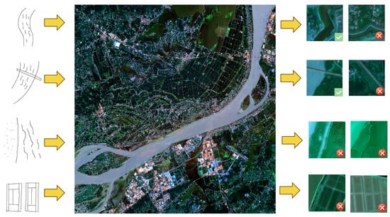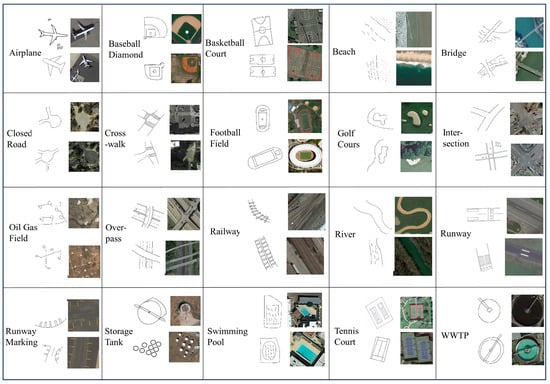 This study used the RSketch dataset [], the RSketch_Ext dataset (expanded based on the RSketch dataset), the Earth on Canvas dataset [], the UCMerge Landuse dataset [], and GF-1 image tiles of the Anhui Province section in the middle and lower basin of the Yangtze River, China. The RSketch dataset, a publicly available sketch–remote-sensing image dataset, comprises 20 categories, including airplanes, baseball fields, and bridges, each with 45 sketches and 200 remote-sensing images. In this study, we expanded the RSketch dataset to RSketch_Ext by augmenting each category with additional remote-sensing images sourced from various public datasets like AID [], NWPU-RESISC45 [], WHU_RS19 [], and others. Furthermore, as part of our HABITAT YANGTZE project, we enlisted the help of 10 non-professional (in remote sensing) volunteers, none of whom possess a background in drawing, to engage in a sketching task. Each volunteer was instructed to create sketches in five categories based on their personal interpretation of the shapes associated with those categories. We then collected the sketches produced by the volunteers and obtained a specific number of sketches from each completed category to enrich the diversity of our augmented dataset’s sketch categories. Concurrently, we enhanced our sketch dataset further by producing simulate sketch from OpenStreetMap (OSM) data. We transformed OSM data into sketch-like images, and integrated these into appropriate sketch categories of our dataset. Post-expansion, each category includes 90 sketches and at least 400 remote-sensing images, significantly increasing the dataset’s size. The sketches are in both TIFF and JPEG formats. Figure 3 presents sample data from each category in the RSketch_Ext dataset. The Earth on Canvas dataset contains 14 categories, five of which are unique compared to those in the RSketch and RSketch_Ext dataset, with each category comprising 100 sketches and 100 remote-sensing images. The UCMerge Landuse dataset is a publicly available dataset for remote-sensing image classification. It features a rich set of image categories in comparison to other remote-sensing image datasets, comprising a total of 21 categories. Among these, 10 categories align with those in the RSketch dataset and RSketch_Ext dataset, each containing 100 remote-sensing images per category. Table 2 presents the classes in RSketch, RSketch_Ext, Earth on Canvas, and UCMerge Landuse dataset. Figure 3 illustrates the sample data corresponding to each category in this dataset. GF-1 images tiles specifically depicted a section of the Yangtze River in Anhui Province, China. There were 4842 image tiles, and each image tile was formatted to a resolution of 256 × 256 pixels.
