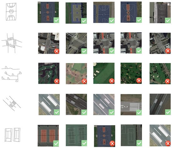 Retrieval results of 5 unseen categories in a test on the RSketch_Ext dataset with the top 5 retrieval results. The green checkmark in the lower right corner of the picture marks the correct retrieval, and the red X in the lower right corner marks the wrong retrieval. The five categories selected are basketball court, crosswalk, oil gas field, runway, and tennis court.