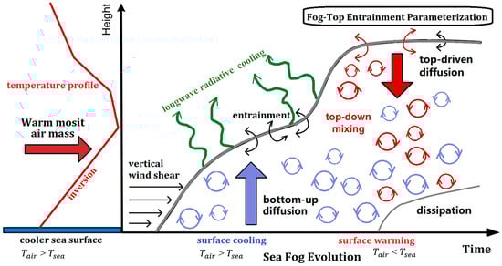 Schematic diagram of sea-fog evolution indicating the inversion before sea-fog formation, bottom-up diffusion generated by vertical wind shear, top-driven diffusion induced by fog-top cooling, and top-down mixing by fog-top entrainment and cooling. The arrow on the left shows warm-moist advection, the upward and downward arrows mark the sources and transport directions of turbulence, the curls mean turbulent eddies (red and blue circles represent the chaotic turbulent eddies driven by top-driven diffusion and bottom-up diffusion, respectively), and the bold and thin gray curves denote the fog top and fog bottom, respectively. and denote 2-m air temperature and sea-surface temperature, respectively. See more details in the text. This figure is derived from Figure 2 in the paper by Yang and Gao [19].