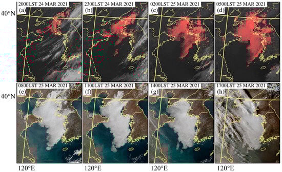 A widespread sea-fog event occurred over the Yellow Sea during 24–25 March 2021. Figure 3 depicts the satellite-observed cloud images of the sea-fog development process. It became apparent that the sea fog originated in the northern region of the Yellow Sea on the night of March 24 (Figure 3a) and subsequently expanded towards the south (Figure 3b–d). Starting at 0800 LST (local standard time; LST = UTC + 8 h) on March 25 (Figure 3e), it appears that the sea fog reached the mature phase, and the portion on land rapidly dispersed after sunrise (cf. Figure 3e,f). Nevertheless, its portion over the sea exhibited a gradual rate of progress (Figure 3e–g). The western boundary of sea fog over the central region of the Yellow Sea was slowly expanding westward, as shown in Figure 3f,g. The sea fog persisted until at least the evening (Figure 3h).
