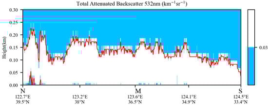 The CALIPSO satellite crossed over the sea fog at around 1336 LST on March 25. The blue line N-S in Figure 1b represents the path of the CALIPSO satellite as it crossed over the sea fog, and Figure 5 displays the corresponding intersection of the total 532-nm attenuated backscatter signals (i.e., aforementioned ) of the CALIPSO. The threshold of 0.03 specified in Section 2.3 is used to distinguish sea fog in Figure 5, where the top and bottom heights of the fog are represented by red lines. As shown in Figure 5, the sea fog top fluctuates above 140 m in many locations, occasionally reaching or exceeding 200 m. In the area just southeast of location N, the top of the sea fog with a dissipated bottom reaches around 200 m. In contrast, the bottom does not dissipate in other regions, especially near location S.