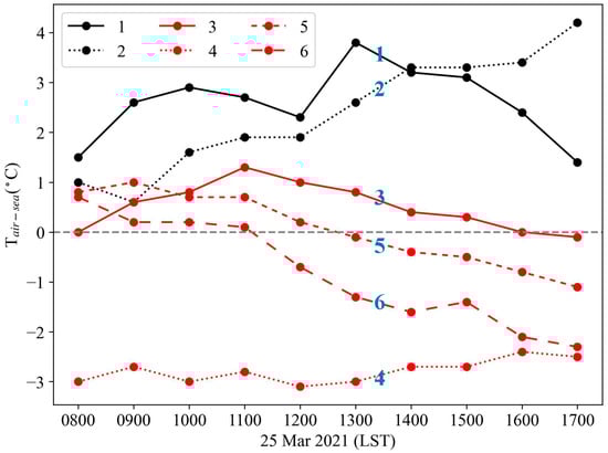 Time series of hourly differences between 2 m air temperature and SST () at six buoys during the period from 0800 LST to 1700 LST on 25 March 2021.
