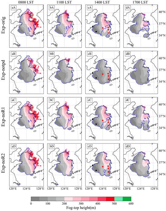 Spatial distributions of simulated sea fog from: (aA–dA) Exp-orig; (aB–dB) Exp-notpd; (aC–dC) Exp-noR1; and (aD–dD) Exp-noR2. The color-shaded region denotes sea-fog depth, and the blue contour depicts the sea-fog area at 10-m height above sea level with a value of LWC greater than 0.016 . The solid dots in panels at 1400 LST denote the buoy sites shown in Figure 1b. The rows correspond to the four experiments and the columns represent four different time points, which are annotated at the top and left sides of the figure.