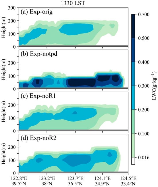 Additional analysis was performed to gain insights of both fog-top height and the vertical structure of the simulated liquid water content. Figure 8 displays the vertical cross-section of LWC (i.e., ) for the four experiments along the north–south orbital track of CALIPSO shown in Figure 1b. The LWC within fog is significantly higher in Exp-notpd than in other experiments, with its maximum value shifted downwards to even reach the middle of the fog layer. This is not consistent with the “fog-top LWC peak” feature mentioned in Section 1, whereas the “fog-top LWC peak” feature appears to be reasonable in the other experiments. However, the average fog-top heights of both Exp-orig and Exp-noR1 appear to have a bias towards being higher, and unrealistic dissipation at the bottom of sea fog is clearly evident (Figure 8a,c).