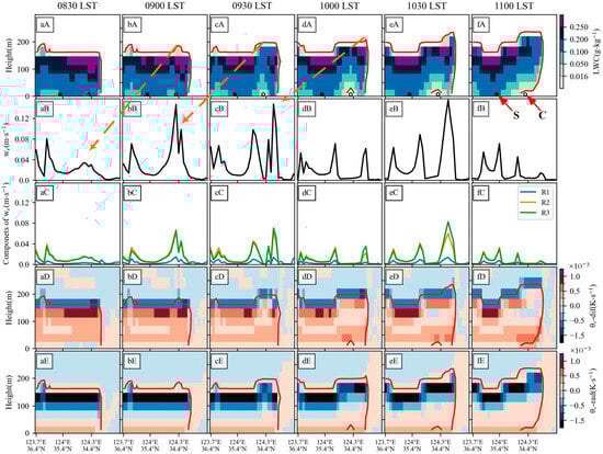 Evolution of the vertical structure of simulated sea fog with time for Exp-orig along the CALIPSO orbital track shown in Figure 5 during the period from 0830 LST to 1100 LST on 25 March 2021: (aA–fA) liquid water content (LWC, i.e., ); (aB–fB) ; (aC–fC) three components of ; (aD–fD) tendency of governed by turbulent mixing (-); and (aE–fE) tendency of governed by longwave radiation (-). Red lines denote LWC with a value of 0.016 , which outlines the sea fog/stratus. In the second row of panels, two dots, one solid and one circular, are labeled S and C, respectively. The bold-dashed brown arrows depict the relationship between the growth of fog-top and . Further information may be found in the text.