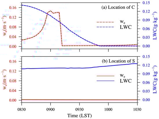 In order to establish a clear link between the process of fog-top entrainment and fog-bottom dissipation, we investigated two specific positions at the bottom. The first position, marked as S in Figure 9, represents a scenario where unrealistic dissipation never took place. The second position, denoted as C in Figure 9, represents a scenario where unrealistic dissipation did occur. Figure 10 shows the temporal evolution of LWC and over time, from 0830 LST to 1030 LST on 25 March. At around 0900 LST, the fog-top entrainment at location C became considerably stronger, while the LWC at the fog bottom rapidly decreased until it approached zero at around 0950 LST (Figure 10a), indicating the dissipation of fog. However, the fog-top entrainment at location S remained very weak, and the LWC near the fog bottom also stayed around 0.12 (Figure 10b), indicating the maintenance of fog.