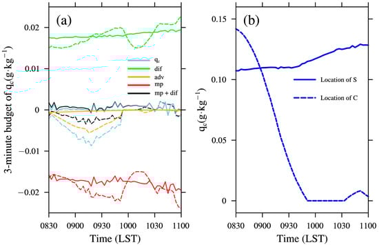 (a) Time series of the budget at 3 min intervals for locations S and C (solid and dashed lines); and (b) of evolution of . The period is from 0830 LST to 1100 LST on 25 March 2021. In panel (a), dif, adv, and mp, represent term-dif, term-adv, and term-mp in the text, respectively. The black line denoted by mp + dif represents the sum of term-mp and term-dif.