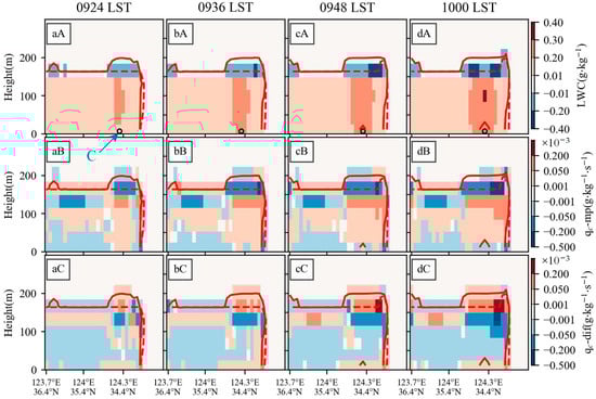 Distribution of Exp-noR2 minus Exp-orig along the CALIPSO orbital track shown in Figure 5 during the period from 0924 LST to 1000 LST on 25 March 2021 for the three variables: (aA–dA) liquid water content (LWC, i.e., ); (aB–dB) tendency of governed by microphysics; and (aC–dC) tendency of governed by turbulent mixing. The solid red line represents the fog-top height in Exp-orig, whereas the dashed red line represents it in Exp-noR2. The circle dot in the first row of panels is at the same position as location C in Figure 9.