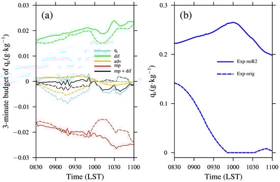 (a) Time series of the budget at 3 min intervals for Exp-orig (solid lines) and Exp-noR2 (dashed lines); and (b) evolution of . The period is from 0830 LST to 1100 LST on 25 March 2021. The definitions of dif, adv, mp, and mp+dif can be found in Figure 11.