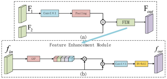 The structure of this module is shown in Figure 1c. Figure 2a shows the operation of one layer; we fuse the difference feature maps of different sizes by pooling convolution for down-sampling and element addition. The feature enhancement module is added to the fusion process of the difference information of the adjacent two layers, which enhances the inference speed of the feature pyramid and improves the performance of the model. Figure 2b shows the structure diagram of the feature enhancement module. The difference feature size obtained by subtracting the elements is ; we adopt a two-branch structure, where one is responsible for extracting channel change information, and the other is responsible for guiding the original features. The upper branch obtains the useful channel information of the differential features through the Global Average Pooling layer, and the obtained feature map is , which is then multiplied by the original feature information of the lower branch to restore the feature size, and then the elements are added to the original features and, finally, the output features are obtained through the convolution layer. The calculation formula of the above process is: