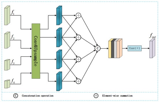 Multiple scale feature maps obtained by element subtraction are ; since the features of each stage have different channel numbers and resolutions, we first use the 1 × 1 convolution layer to sample them up to the same size 64 × 128 × 128 by bilinear interpolation. The expanded feature map is ; then, the adjacent feature maps are densely linked to obtain four new features . Finally, the concat operation is used to stitch on the channel dimension, and then the number of channels is restored through the 1 × 1 convolutional layer to obtain the final output feature. Therefore, encodes the detailed information from the shallow layer and the deep semantic information jointly and, finally, a feature map with richer context information and stronger representation is obtained. The calculation formula of the above process is as follows: