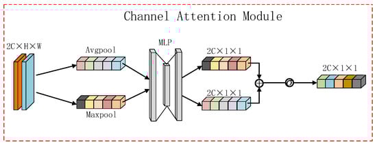 Figure 6 shows the structure of the channel attention module, which keeps the channel dimension unchanged, compresses the spatial dimension, and focuses on the meaningful information in the input features. The size of the input feature map is 2C × H × W. Firstly, the spatial information is squeezed by average pooling and maximum pooling operations to refine the channel, the feature map is compressed into two tensors of 2C × 1 × 1. Then, the two tensors are input into a shared multi-layer perceptron (MLP) with a hidden layer, and the obtained output is combined into a feature vector by element-by-element summation. Finally, the importance of each channel is obtained by assigning different weights to each channel through function excitation. The formula can be described as:
