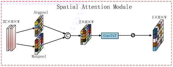 Figure 7 is the spatial attention module structure, which keeps the spatial dimension unchanged, compresses the channel dimension, and focuses on the position information of the target. Its input is the output after multiplying the original feature elements by CAM. Firstly, the channel information is squeezed by average pooling and maximum pooling operations to refine the spatial dimension, and the feature map is compressed into two tensors of 1 × H × W. Then, the Concat splicing operation is performed on two layers, and the feature map of 1 channel is transformed by 7 × 7 convolution. Finally, the feature map output of SAM is obtained by a sigmoid function. The formula is as follows: