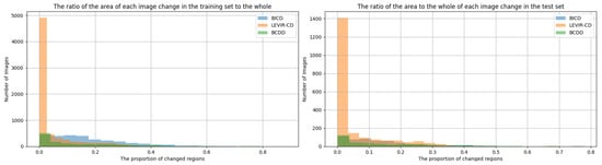 To validate its effectiveness, we conducted tests on our in-house dataset and two publicly available benchmark datasets. In this section, we first analyze the three datasets. By examining the change regions in each image, we can gain a comprehensive understanding of the dataset composition. As shown in Table 1, the proportion of change regions in the three datasets is relatively small compared to unchanged areas. To provide a more intuitive representation, we counted the number of images at different proportions. As illustrated in Figure 8, the horizontal axis represents the proportion of change area to the overall image, while the vertical axis indicates the number of images within each proportion. From the data analysis graph, it can be observed that the majority of images have change area proportions within 20%.