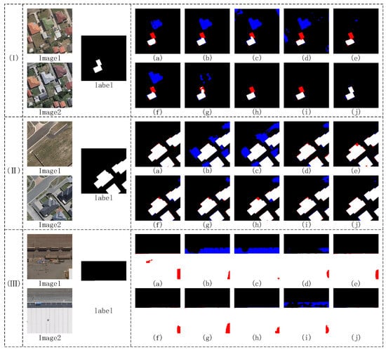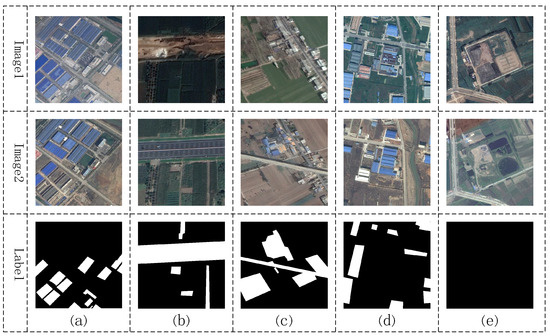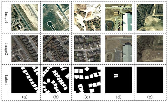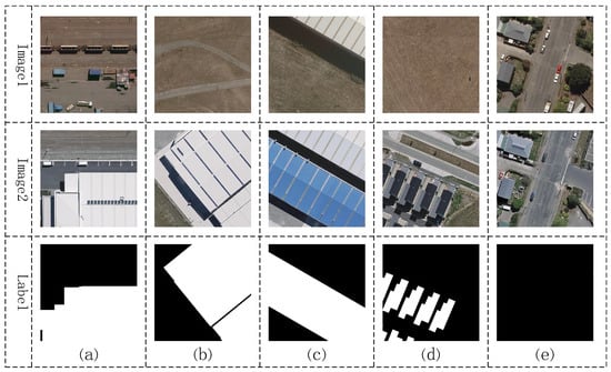 LEVIR-CD dataset. (a–c) shows the areas of added buildings, (d) shows the areas of removed buildings, and (e) shows the unchanged areas.