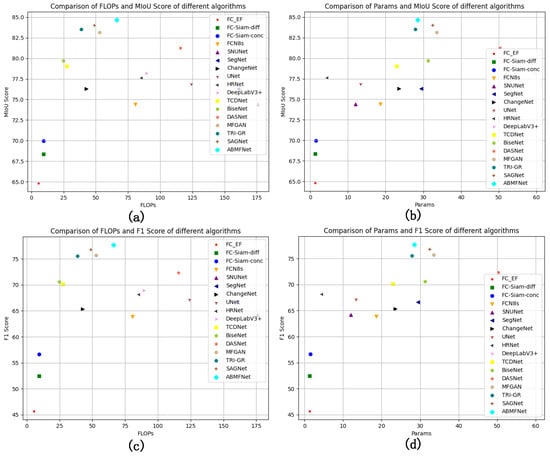 In this section, we conduct a comprehensive comparison between our proposed model ABMFNet and a range of existing change detection models, including traditional ones such as FC_EF, FC-Siam-Diff, FC-Siam-Conc [60], SNUNet [61], ChangeNet [62], TCDNet [63], DASNet [64], MFGAN [43], TFI-GR [65], and SAGNet [38], as well as deep learning models like FCN8s [33], SegNet [66], UNet [32], HRNet [55], DeepLabV3+ [67], and BiseNet [68]. We evaluate these models based on several criteria, including their complexity and parameter count, as well as F1 score and MIoU values. To provide a more intuitive representation, we present scatter plots in Figure 13. Our analysis reveals that ABMFNet demonstrates moderate levels of complexity and parameter count. More importantly, compared to both traditional and deep learning-based models, ABMFNet achieves significant improvements in both the F1 score and MIoU values. Furthermore, when compared to recent effective models such as MFGAN, TFI-GR, and SAGNet, ABMFNet outperforms them in terms of F1 score and MIoU values while adding only a minimal amount of FLOPs and reducing the parameter count. This highlights the effectiveness and efficiency of our proposed ABMFNet model in remote sensing change detection tasks.