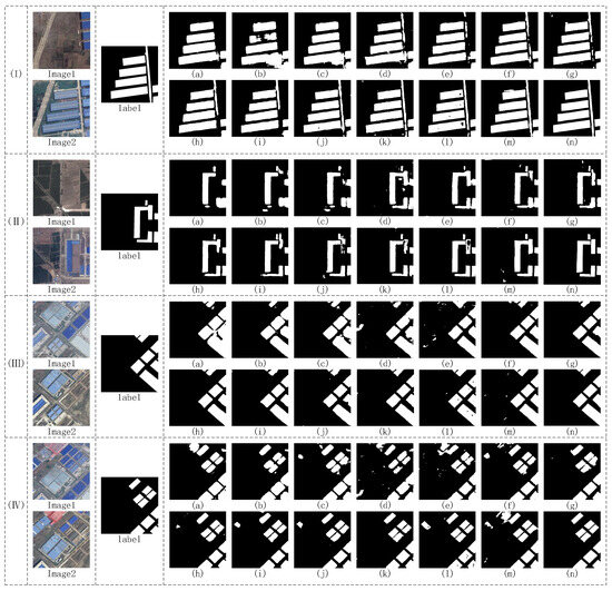 The prediction graphs of several algorithms are compared on the BICD dataset. Different remote sensing images are shown in (I–IV). Image 1 and Image 2 are bitemporal remote sensing images from different periods. (a–n) represent the prediction maps of FC_EF, FC-Siam-Diff, FC-Siam-Conc, SNUNet, ChangeNet, HRNet, DeepLabV3+, TCDNet, BiseNet, DASNet, MFGAN, TFI-GR, SAGNet, and ABMFNet, respectively.