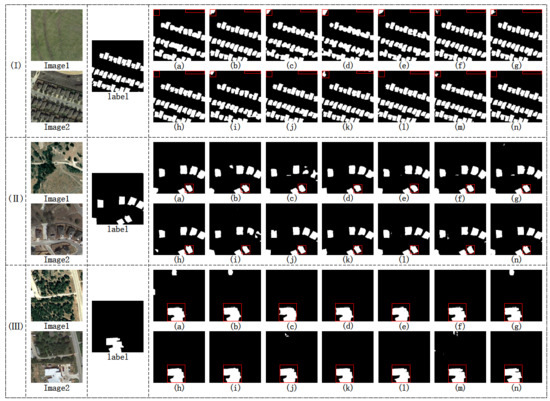 The BICD dataset contains 3420 pairs of 512 × 512 resolution bitemporal remote sensing images. It is a data set collected by our laboratory from Google Earth to verify the validity of the model. Among them, 2280 were used for training, 570 for verification, and 570 for testing. Compared with other datasets, the remote sensing images in this dataset are composed of photo pairs taken at different locations in eastern China from 2010 to 2019, including various industries, farms, highways and various buildings. The label of the data set is manually completed by us and a unified clipping is performed. In order to avoid the partial change area being cut into small sub-regions during the cutting process, it is ensured that each complete change area has a corresponding slice, and some areas between the slices overlap to ensure that the information of the change area is accurate enough. As shown in Figure 9, we show some representative samples from various categories of the dataset. We can observe that our dataset has more objects, environmental information, and more types of changes. In order to replicate the actual application settings as close as possible, we intentionally include several image pairs with high angle deviations. We also selected some image pairs captured in various seasons to consider seasonal variations. In addition, the image pairs of the unaltered regions are added to the data set to appropriately increase the imbalance between the samples in order to more clearly distinguish the advantages and disadvantages of the model.