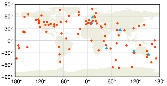 Station distribution for clock offset estimation (red dots) and PPP-AR (blue triangles).
