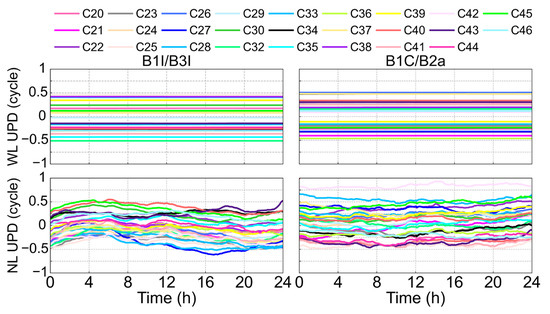 The integer characteristics of ambiguities are destroyed as the code and phase hardware delays are difficult to separate from the ambiguities. These delays should be precisely estimated before clock offset estimation. The UPD performance is the prerequisite for the undifferenced AR. Therefore, its performance is of great interest for this study. The satellite WL and NL UPDs of each epoch on DOY 172 for two signal combinations are displayed in Figure 3. In this figure, one satellite (C19) is selected as a reference. The satellite WL UPDs are remarkably stable for one day for both combinations, which is nearly constant within a day for each satellite. Compared to the WL UPDs, the larger fluctuations of the NL UPD time series can be observed. The largest fluctuation for B1I/B3I signals happened at C26 (0.678 cycles) and for B1C/B2a signals at C21 (0.530 cycles) on the test day.