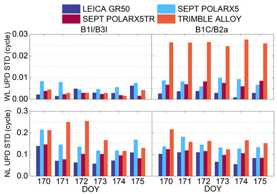 When performing undifferenced AR, the receiver UPD is also needed. The STDs of the UPDs on the receiver end are thus also assessed and shown in Figure 5. Except for Trimble alloy receivers, the WL UPD performance of the receiver shows similar performance for these two signal combinations. The STDs of the WL UPDs exhibit poor behaviors for Trimble alloy receivers when using the B1C/B2a signals, which may be related to its receiver hardware. For NL UPDs, the STDs calculated from these two signal combinations exhibit comparable performances. The mean STDs for the receiver WL UPDs are 0.004 cycles for B1I/B3I signals and 0.011 cycles for B1C/B2a signals, whereas the NL UPD stability are 0.131 cycles for B1I/B3I signals and 0.125 cycles for B1C/B2a signals.