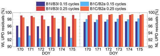 When the UPDs are removed from ambiguity, the ambiguity is near to an integer, and the difference between this value and the integer is regarded as the UPD residual [36], which is an indicator to check the estimated UPD quality. Figure 6 presents the daily UPD residual distribution percentages for both WL and NL and both frequency combinations. The WL UPD residual distribution of B1I/B3I signals is from 95.3% to 96.2% and 99.0% to 99.3% for (−0.25, 0.25) and (−0.15, 0.15) cycles, respectively, while for B1C/B2a signals, it is from 92.4% to 93.3% and from 98.0% to 98.6%, respectively. The distribution of WL UPD residuals for B1I/B3I signals is better due to its longer wavelength. Compared to B1I/B3I signals, the NL UPD residual distribution of the B1C/B2a signals is slightly better for both (−0.15, 0.15) and (−0.25, 0.25) cycles, which may be caused by the better observation quality of the B1C/B2a signals [12,35]. The NL UPD residual distribution shows better performance compared to that of the WL UPD.