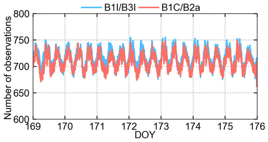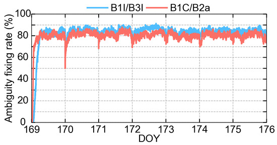 Figure 4 presents the standard deviations (STDs) of the daily mean satellite WL and NL UPDs. It can be observed that the stability of the WL UPDs is better when utilizing the B1I/B3I signal, while the STDs of the NL UPDs estimated using the B1C/B2a signals present better performance. The WL and NL wavelengths of B1I/B3I signals amount to 1.025 and 0.106 m, respectively, while they amount to 0.751 and 0.109 m for B1C/B2a signals, respectively. A larger wavelength implies less sensitivity of the integer ambiguity fixing to the measurement noise and mis-modeled effects. The mean STD of the NL UPDs is 0.122 cycles for B1I/B3I, and 0.081 cycles for B1C/B2a signals, showing better stability of the NL UPDs estimated from the B1C/B2a signals. Although the NL wavelength of these two signal combinations is nearly identical, the NL UPD stability using B1C/B2a is superior, which could be caused by its better observation quality [12,35]. Moreover, the STDs are larger on DOY 170 than on other days for both the WL and NL UPDs, which could be caused by the convergence problems during the initial processing time.