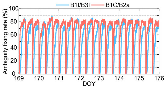 Epoch-wise ambiguity fixing rates for two signal combinations with the processing restarted every 8 h.