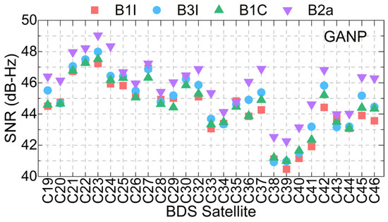 Mean SNR of each frequency for each BDS-3 satellite at GANP stations on DOY 172, 2023.